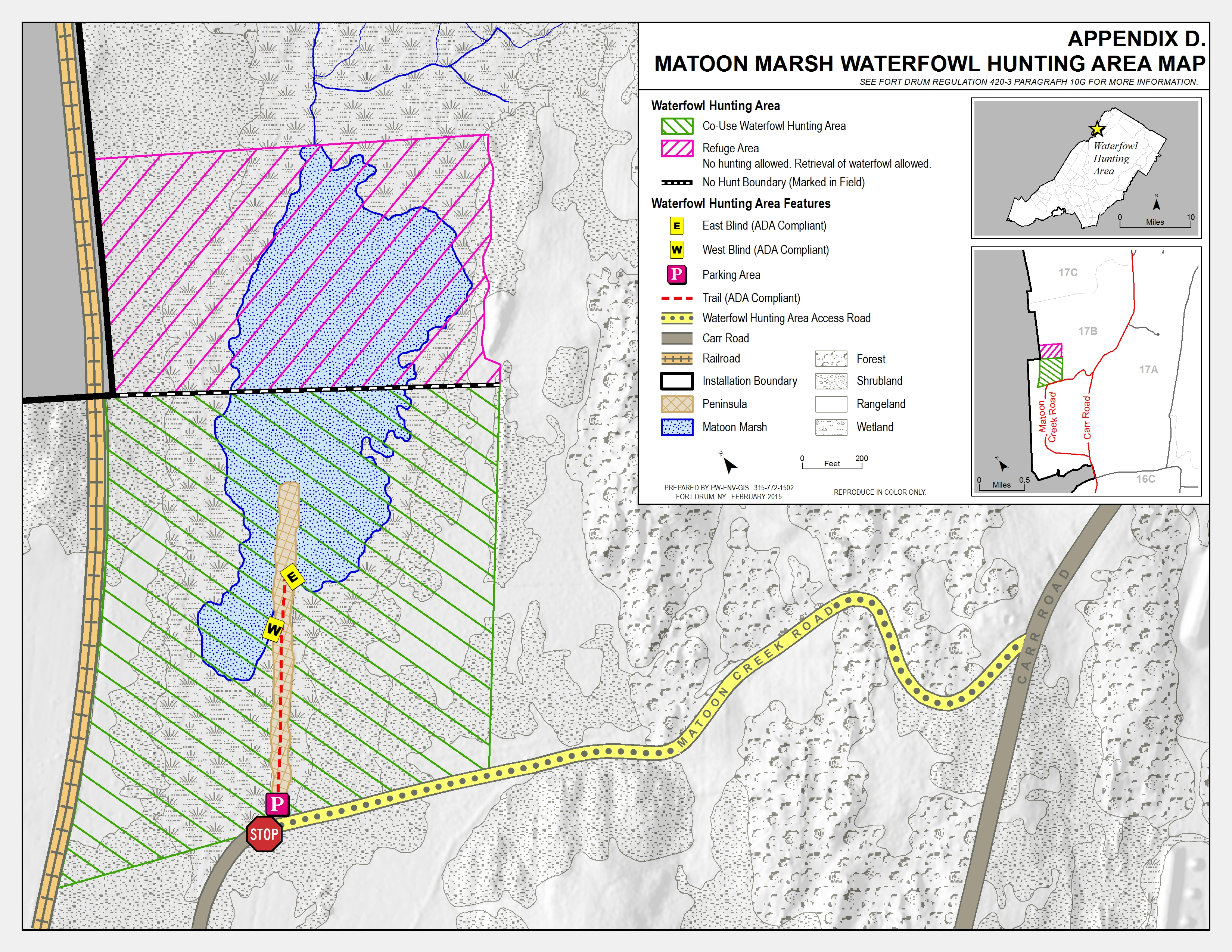 The Matoon Creek Hunting Area in Training Area 17B is accessed from a parking area located off of Matoon Creek Road and down a universally accessible trail on the peninsula leading into the marsh. The first approximately 400 yards of this area (including the shrubs, cattails, and entire peninsula area) is within the "hunting area"; the latter 250 yards north of the peninsula and including the north end of the open water area is considered "refuge." Access to the "refuge" is limited to retrieving any downed birds--no other act of hunting is allowed, except as identified below. The refuge boundary is delineated with orange buoys attached to posts in the water.